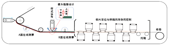 ◆SDC单向双面涂布机在A面涂布后,未经过烘干直接进行B面涂布,湿态同时干燥,上下层收缩同步,有效避免因极片加热烘烤收缩导致的A\B面对齐误差问题